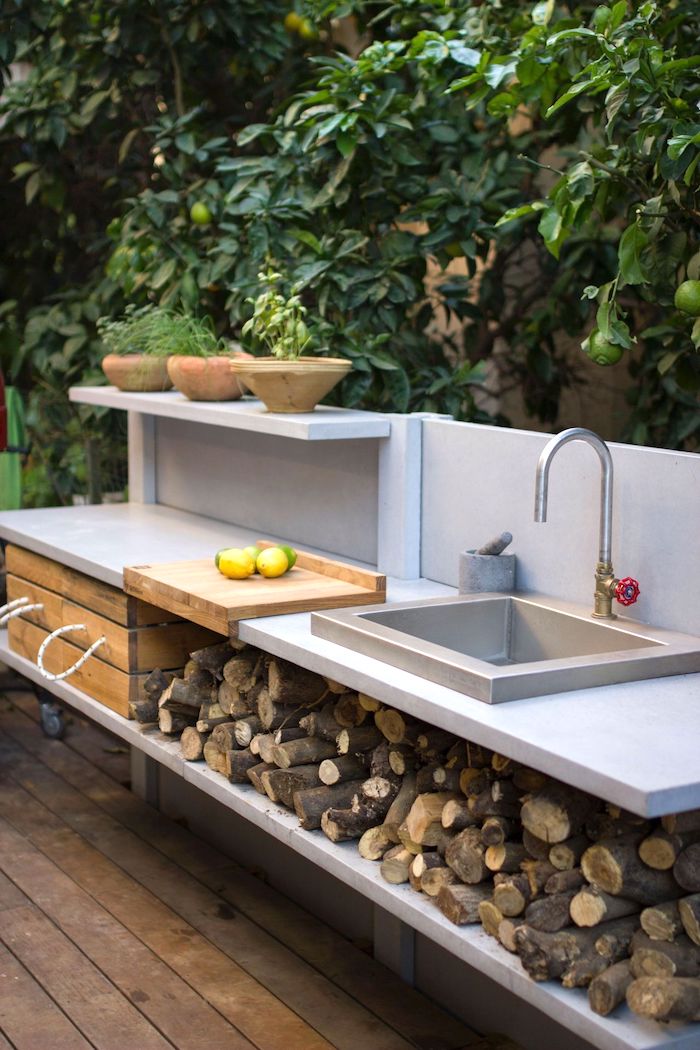 ►Место для хранения утвари. Кухня есть кухня, независимо от того, в доме она находится или на улице, а значит, и мест для хранения здесь должно быть в достатке. Будь то тумбы, шкафы с полками, стеллажи или просто обычные ящики.