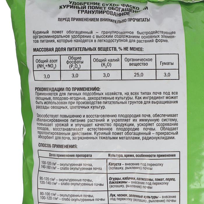 Можно сказать, что гранулированный птичий помёт по своим свойствам лучше всех известных органических удобрений, а по быстроте усвояемости и наличию питательных веществ не уступают комплексным минеральным удобрениям.