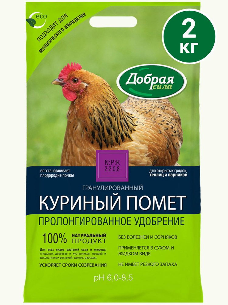 Куриный помёт в гранулах является комплексным универсальным органическим удобрением. Это натуральное и очень эффективное удобрение, содержащее множество макро- и микроэлементов, органических веществ. В среде садоводов оно ценится наиболее высоко. Им можно удобрять большинство видов растений — ягоды, томаты, огурцы, корнеплоды, кустарники, цветы. Оно подходит для всех видов почв.