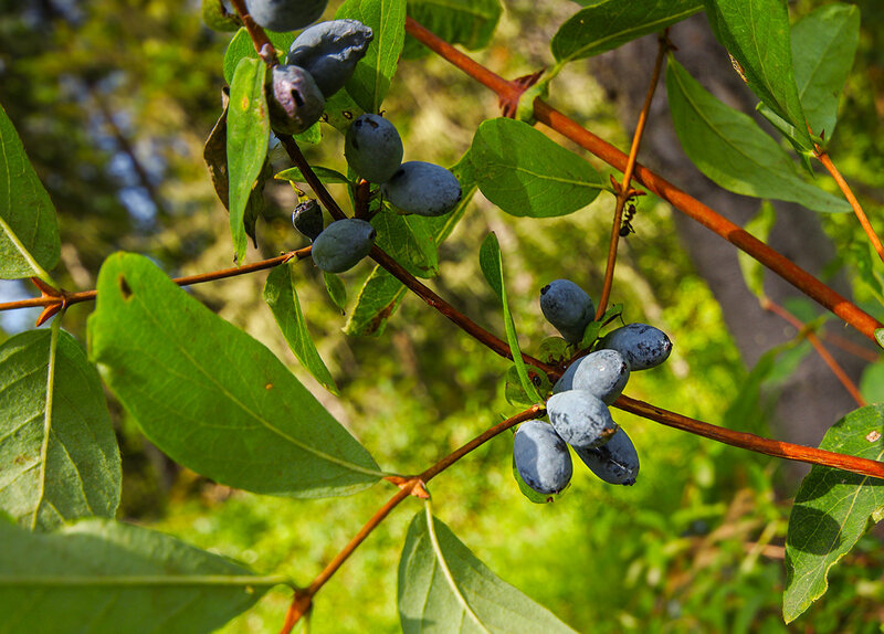 Жимолость съедобная. Латинское название — Lonicera edulis. Это низкорослый кустарник, высота которого не превышает одного метра. Тёмно-синие продолговатые ягоды длиной около сантиметра созревают одними из первых — уже в середине или конце июня. Ягоды обладают приятным кисло-сладким вкусом, внутри в фиолетово-красой мякоти скрываются мелкие коричневатые семена.