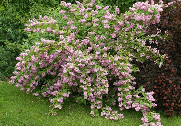 Красивоцветущие кустарники с темными листьями и цветками рекомендуют сажать на переднем плане, рядом с дорожками.