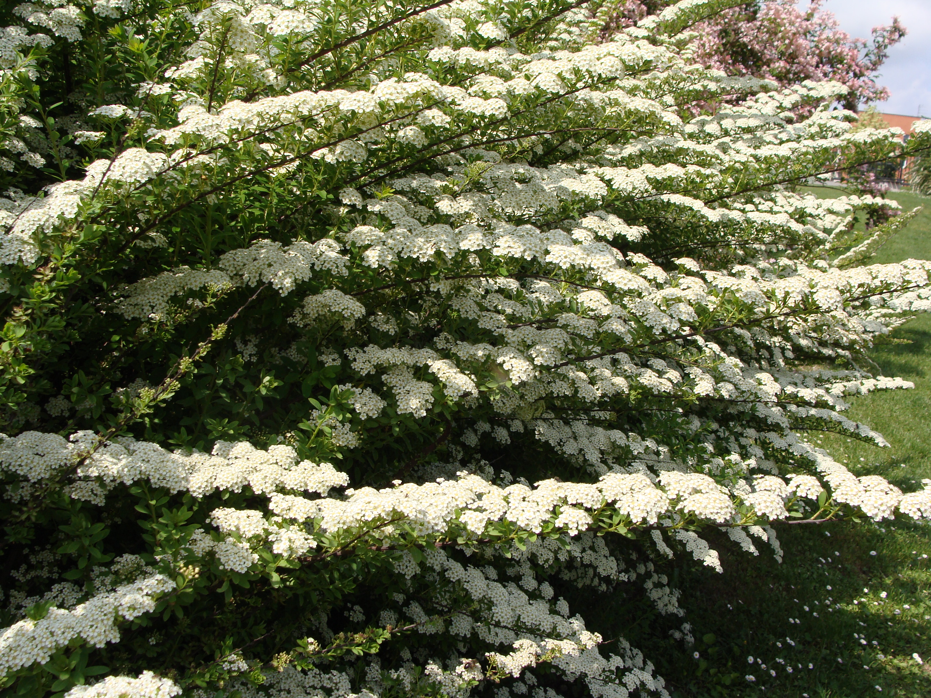 Середина мая — время цветения Спирея Грефшане — небольшой кустарник высотой до 1,5 м, с белоснежными цветками, собранными в многочисленные соцветия, расположенные по всему стеблю. Со свисающими стеблями крона выглядит очень нежной. Кустарник светолюбив, засухоустойчив, не требователен к почве.
