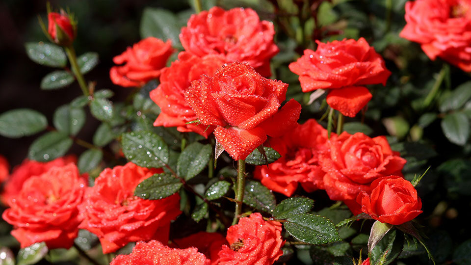 - Красные розы — включают сорта, лепестки которых красные, а также с оттенками жёлтого и оранжевого цветов.