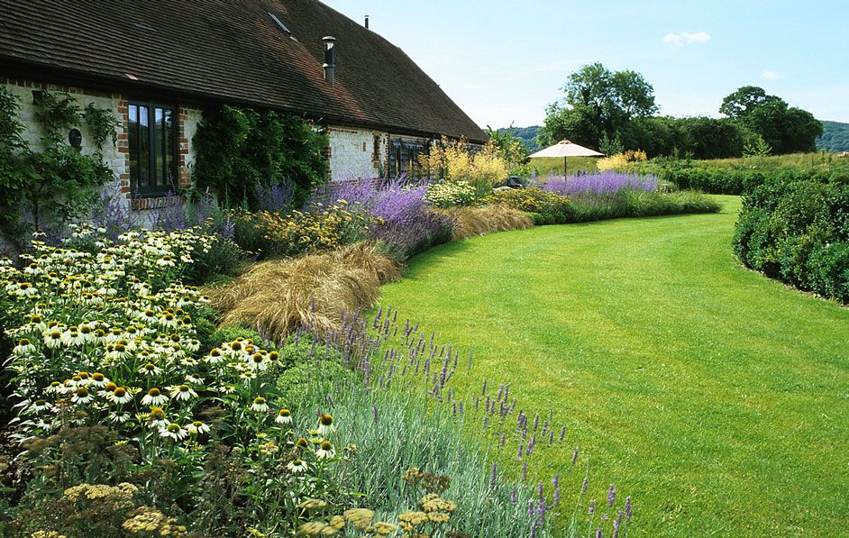 В отличие от изысканных французских газонов, участки в деревенском стиле не обязательно должны быть идеальными.