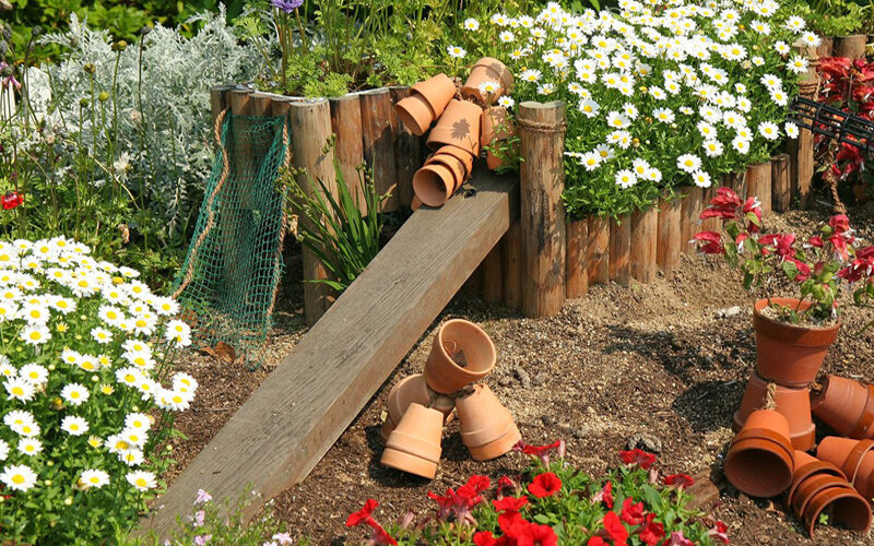 Еще один вариант того, как сделать двор милым – это организовать разнообразные кадки для выращивания цветов. Совершенно необязательно покупать в магазине дорогие изделия для этих целей. Они могут быть приготовлены собственноручно из старых ненужных вещей. В качестве основы подойдут – отслужившие кастрюли разного диаметра, старая ванная или стиральная машина. Для того, чтобы придать им привлекательный внешний вид, их достаточно покрасить в нужный цвет специальной краской по металлу. Не забыть подобрать колористический оттенок, подходящий под цветовое пространство окружающей среды.