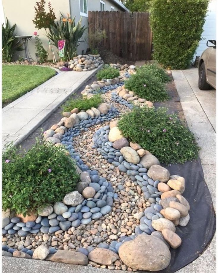 Такое украшение сделает ваше подворье уникальным и эффектным. Уход за ручьём будет заключаться в поддержании формы его русла, своевременного удаления сорной травы и опавших листьев. Растения, высаженные для декорирования, чаще всего — многолетники, не требующие пристального внимания и заботы. Сухой ручей поможет отвести от построек излишки влаги и не станет при этом прибежищем для лягушек и комаров.