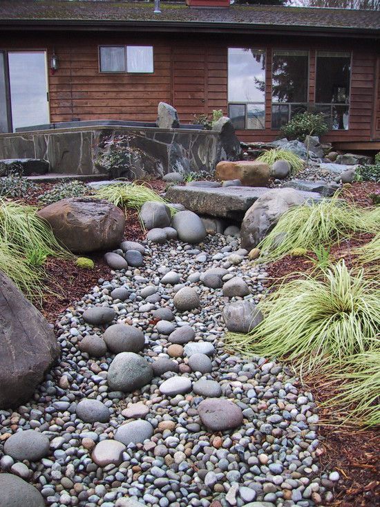 Затоки могут быть засажены травой или, если они несут большой объем воды, превращены в сухое русло ручья. Сухое русло ручья может быть декоративным, функциональным и добавит изюминку вашему ландшафту.