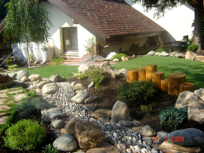 - Со стороны искусства ландшафтного дизайна так же имеется ряд правил. Искусственный ручей, выложенный из гальки, совершенно не сочетается с яркими насыщенными растениями.
