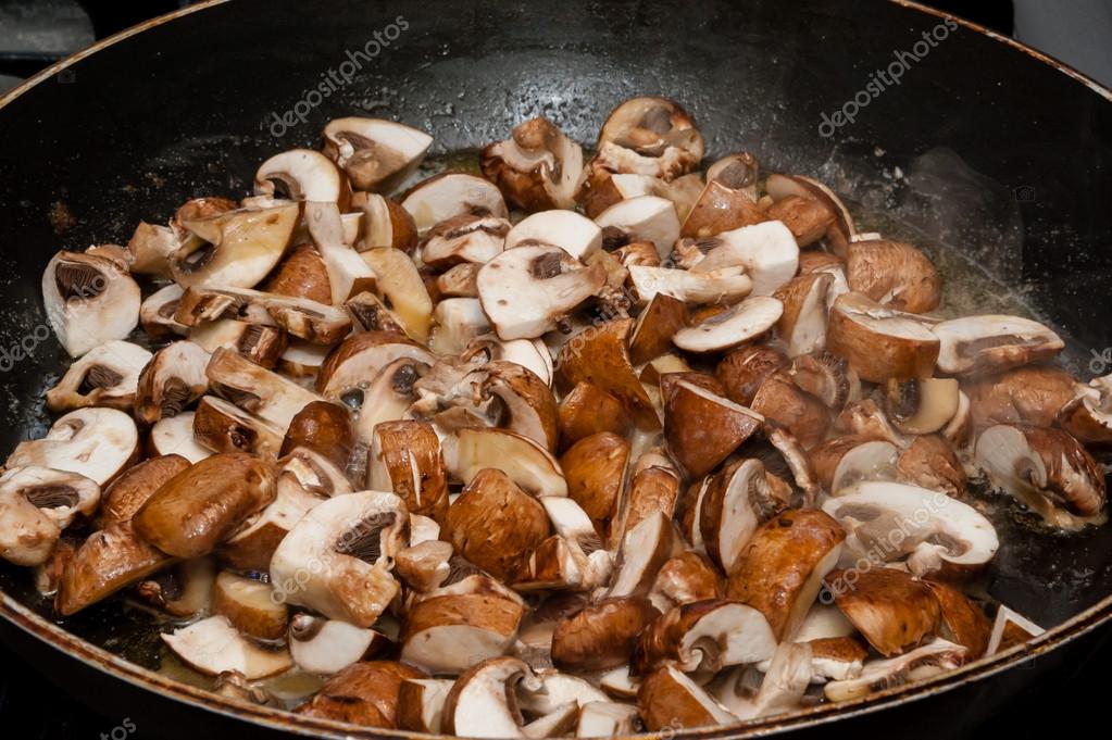 — Если жарятся шампиньоны или неотваренные благородные лесные грибы (рискуете), то сначала обжаривайте их на сухой сковороде 2-3 минута, а затем добавляйте масло.
