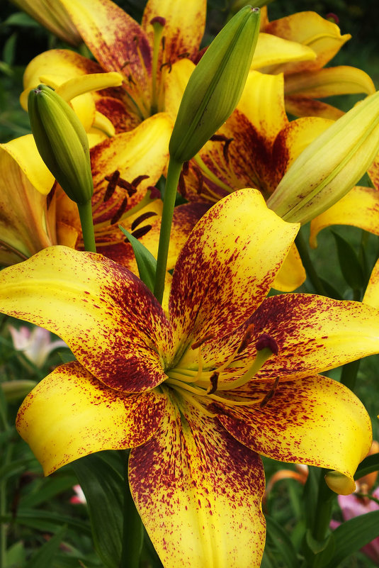 Лилии имеют крупные бутоны, поэтому их лучше сочетать с цветами с мелкими соцветиями.