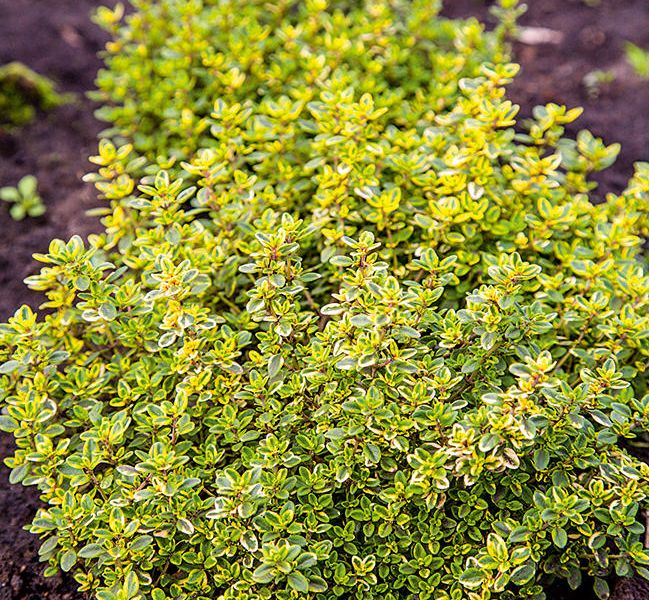 Низкорослые растения лимонного тимьяна выглядят как вечнозеленый кустарник с небольшой листвой, пахнущей лимоном.