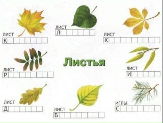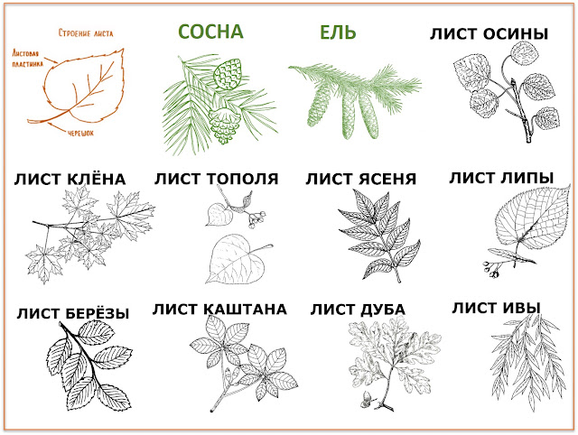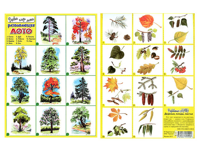Распечатайте листы с изображением деревьев, их листьев, семян и кратким описанием каждого дерева. К каждому дереву прилагаеются изображения листьев, которые можно расскрасить. Задания в которых надо написать названия деревьев угадав их листья.