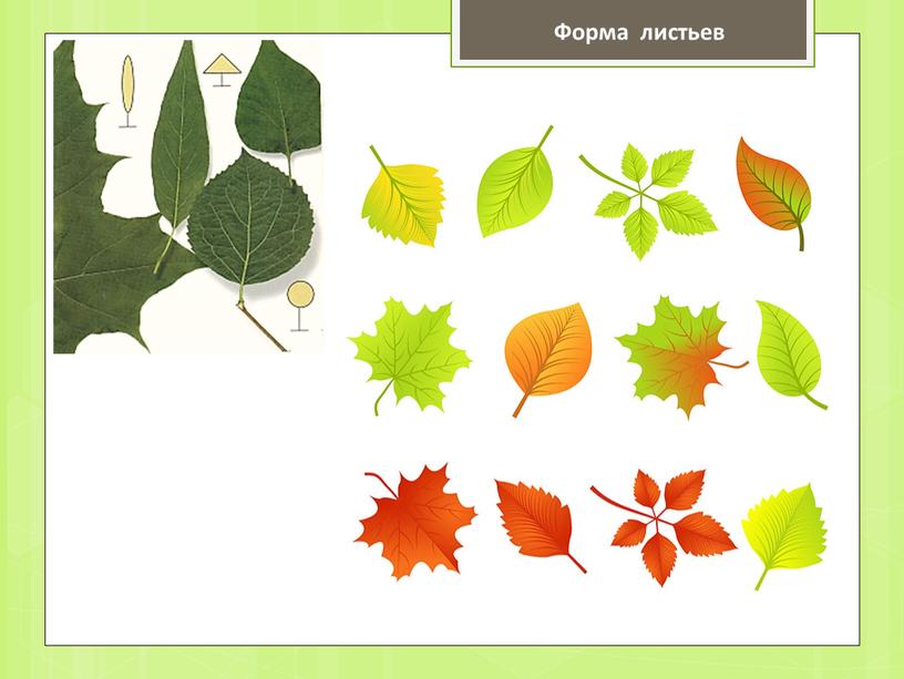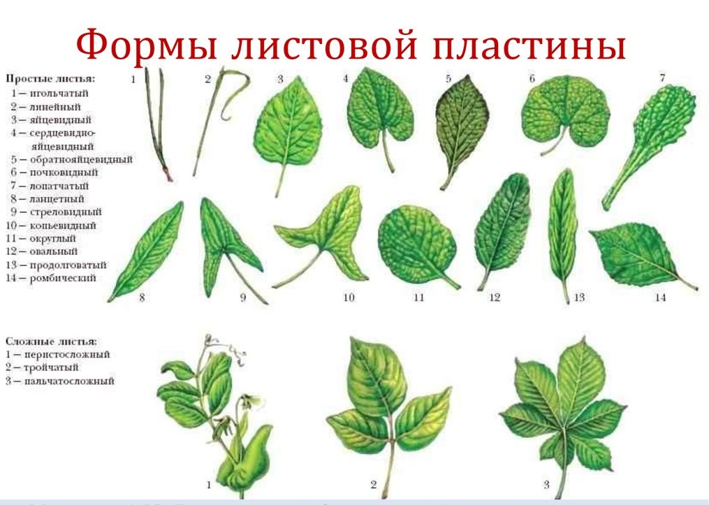 Самая простая классификация листьев растений осуществляется по их форме. Согласно ей, существуют листовидные отростки (например, у папоротников), листья цветковых растений (классическая форма с черешком и листовой пластинкой), хвоя и обверточные листья (распространены у трав).