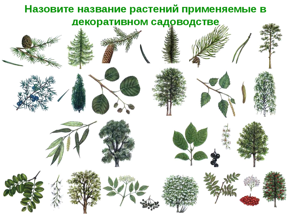 Какие деревья, вы знаете? Отличаются ли деревья от кустарников? Чем? Деревья живые или неживые? Кто (или что) им помогает расти? Чем их надо поливать: водой или молоком? (Показать рисунки деревьев) Как называется это дерево? Какое оно по величине? Где чаще всего растет? Из каких частей состоит? Какую пользу может принести людям? Как изменяется в разные времена года? Что можно сделать из этого дерева? Почему люди сажают деревья на улицах города?