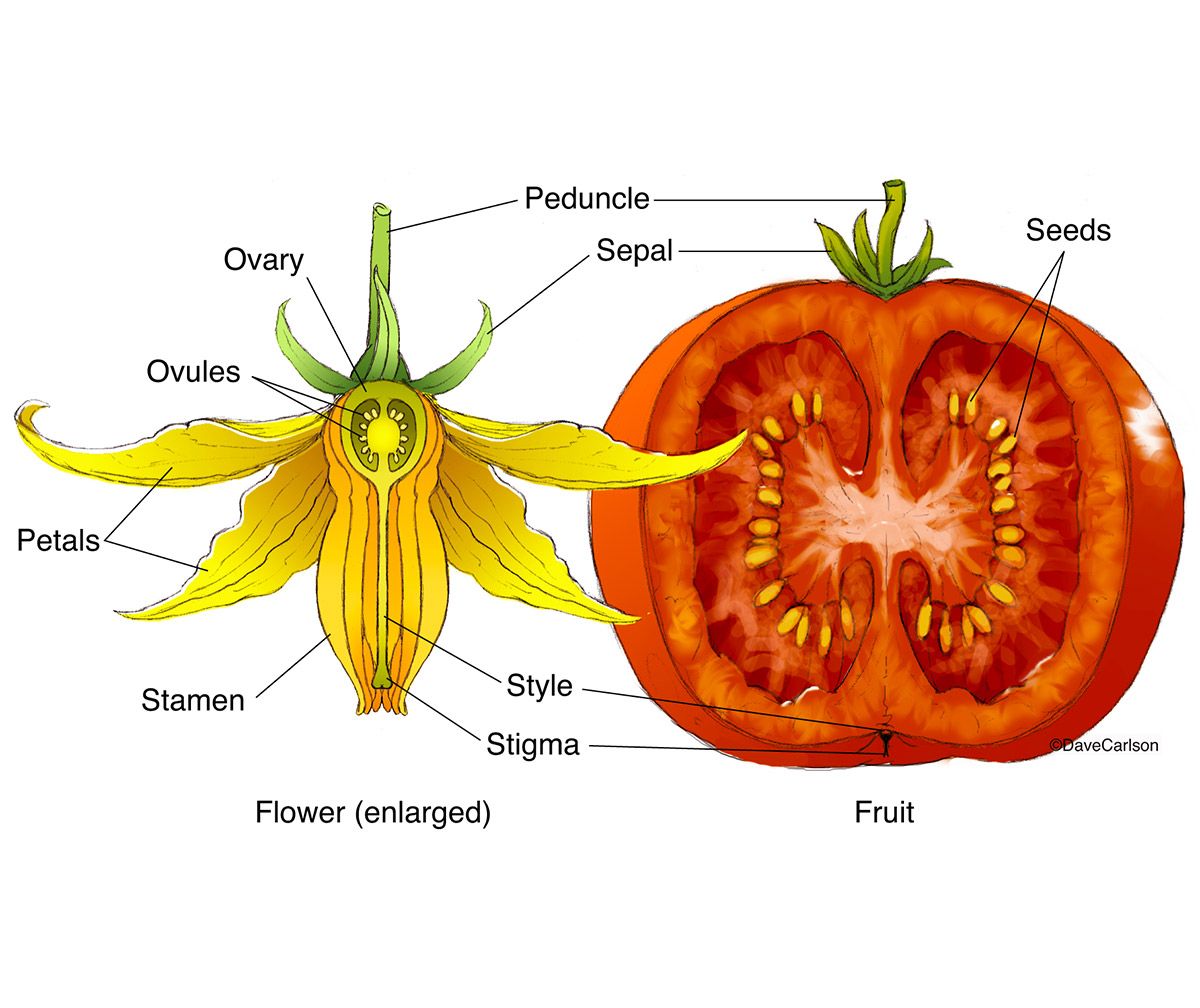 Плоды томатов – сочные ягоды, в зависимости от сорта и условий роста, бывают диаметром от 25 до 80 мм, гладкие или ребристые, по форме – округлые, плоскоокруглые, овальные, сливовидные, округлоцилиндрические, удлиненные, перцевидные, грушевидные. Масса плода, в зависимости от сорта, бывает от 20 до 1000 г (максимально при нормировании количества завязей в кисти до 2000 г).