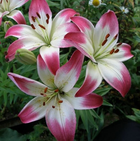 Белые лилии с розовыми кончиками и чудными пурпурно-коричневыми крапинками, рассыпанными по лепесткам, похожи на нарядную широкую чашу. Внутри каждого цветка чётко просматриваются зелёные тычинки с оранжевой пыльцой. Яркие бутоны источают нежный чарующий аромат сильной насыщенности.