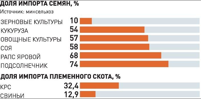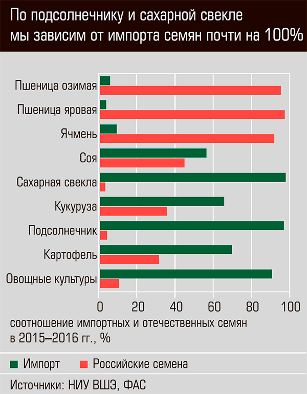 Виктор Якушев, директор Агрофизического научно-исследовательского института Российской академии наук, подтверждает, что посевной материал для большинства сельскохозяйственных культур России закупается преимущественно за рубежом.
