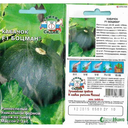 Продуктивный гибрид кабачка для производства плодов в теплицах весной и в открытом грунте летом и осенью. Вступает в фазу плодоношения через 40-45 дней после посева.