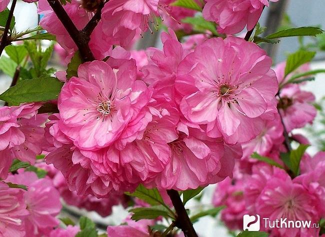 - Китаянка. Известный гибрид. Ветки у куста растения прямостоящие, зацветает рано и не отличается яркой окраской. Способ выведения – прививка на войлочную вишню. Внешне очень напоминает сакуру.