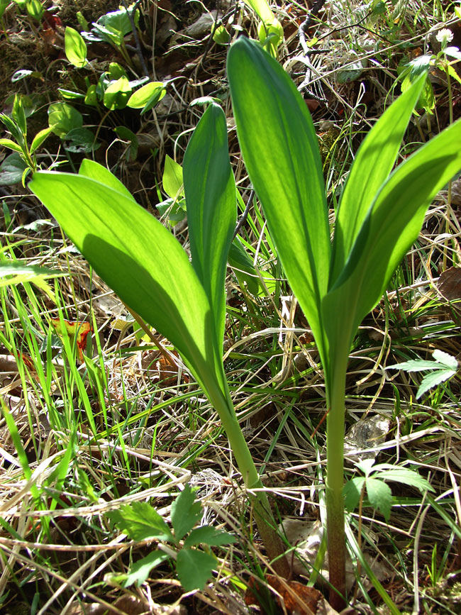 Листья в числе от двух до четырёх, гладкие; пластинка листа ланцетная или эллиптическая, острая или тупая, длиной 10—20 см, шириной 2—8 см, постепенно суженная в черешок, который в два — четыре раза короче пластинки. Низовые листья чешуевидные, срединные — зелёные с ланцетной или широкоэллиптической пластинкой.