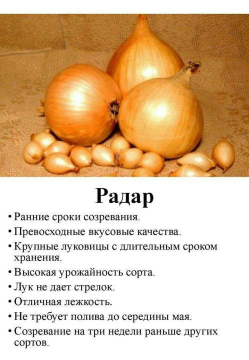 Variety Radar — сладкий полуостровный лук, выведенный голландскими селекционерами более двадцати лет назад.У него средний срок созревания — через 250 дней с момента посадки в грунт луковицы готовы к сбору урожая. В конце мая можно собирать урожай.