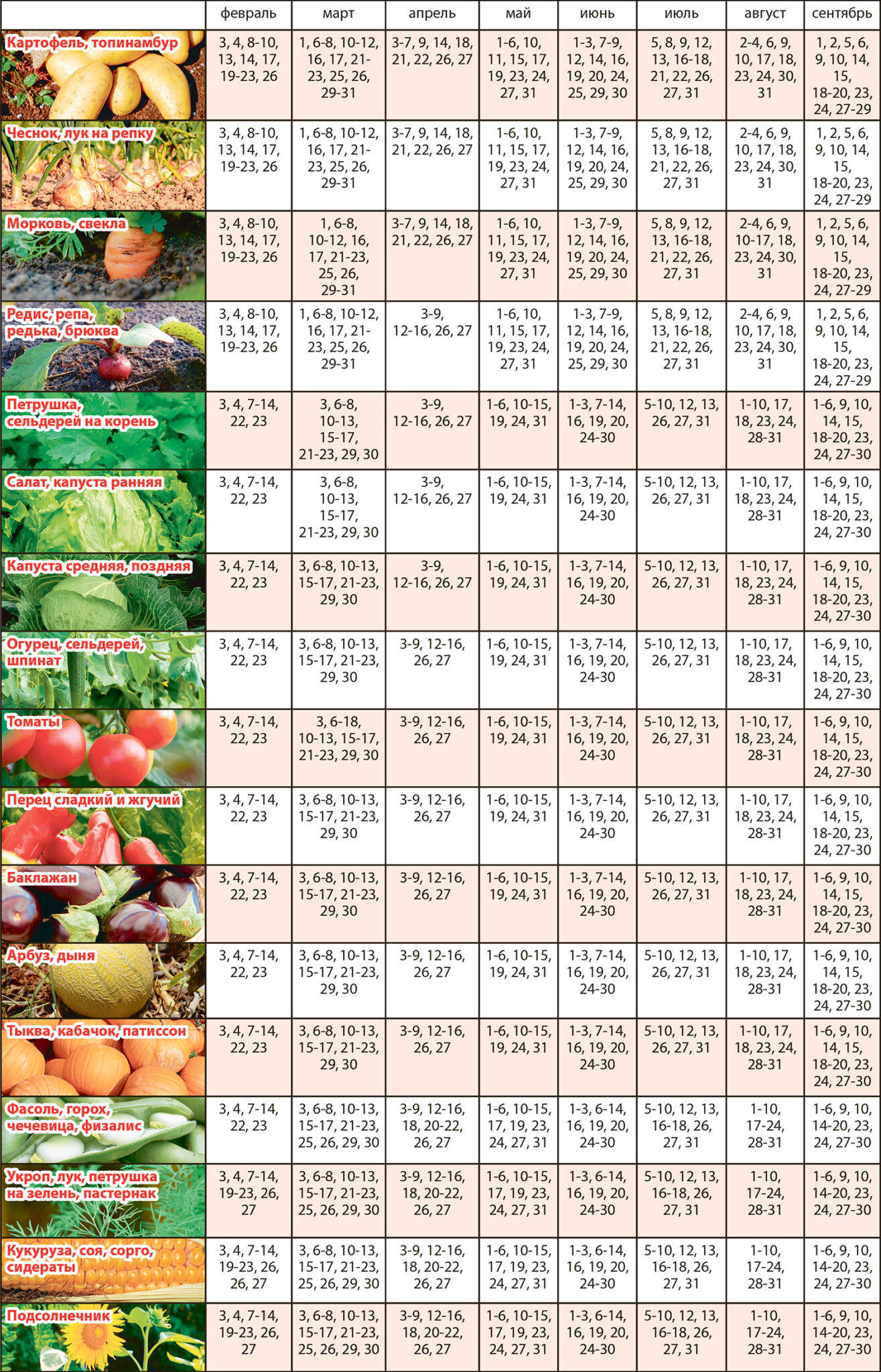 | Огурцы | 5, 7, 8, 9, 12, 13, 16, 17, 21, 22, 25, 26 | ||