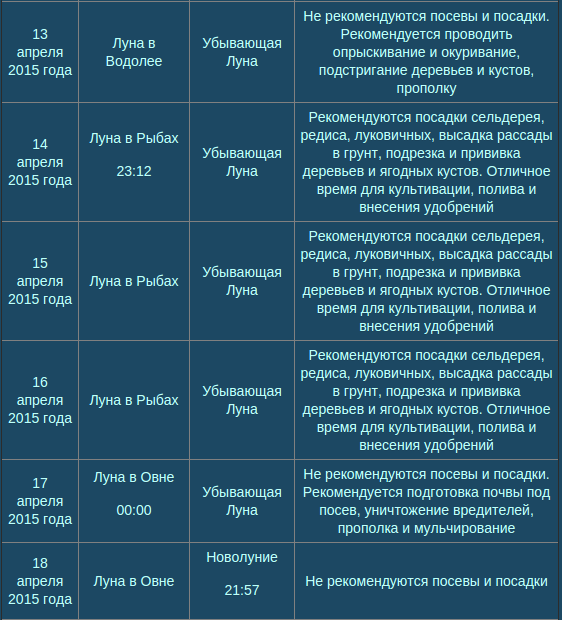 | АПРЕЛЬ | 2, 3, 5, 6, 11, 14, 19, 20, 25, 26, 29, 30 | 1, 2, 3, 4, 7, 8, 10, 11, 14, 18, 19, 20, 25, 26, 29 | 2, 3, 4, 9, 12, 17, 20, 21, 22, 25, 26, 29, 30 | 1, 4, 8, 10, /11 и 19 и 28/-(вредит. ) | 4, 7, 10, 13, 14, 15, 16, 26, 28 | 7, ПЛ 8, 9, 22, НЛ 23, 24 |