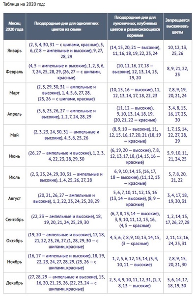 | Месяц 2020 года | Плодородные дни для однолетних цветов из семян | Плодородные дни для луковичных, клубневых цветов и размножающихся корнями | Запрещается высаживать цветы |