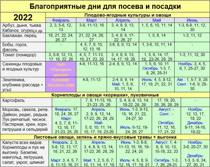 | Запрещенные дни для посадки и пересаживания растений в 2022 году | 3-5 | 2-4 | 3-5 | 2-4 | 2-4 | 1-3, 30 | 1-2, 29-31 | 28-30 | 26-28 | 26-28 | 24-26 | 23-25 |