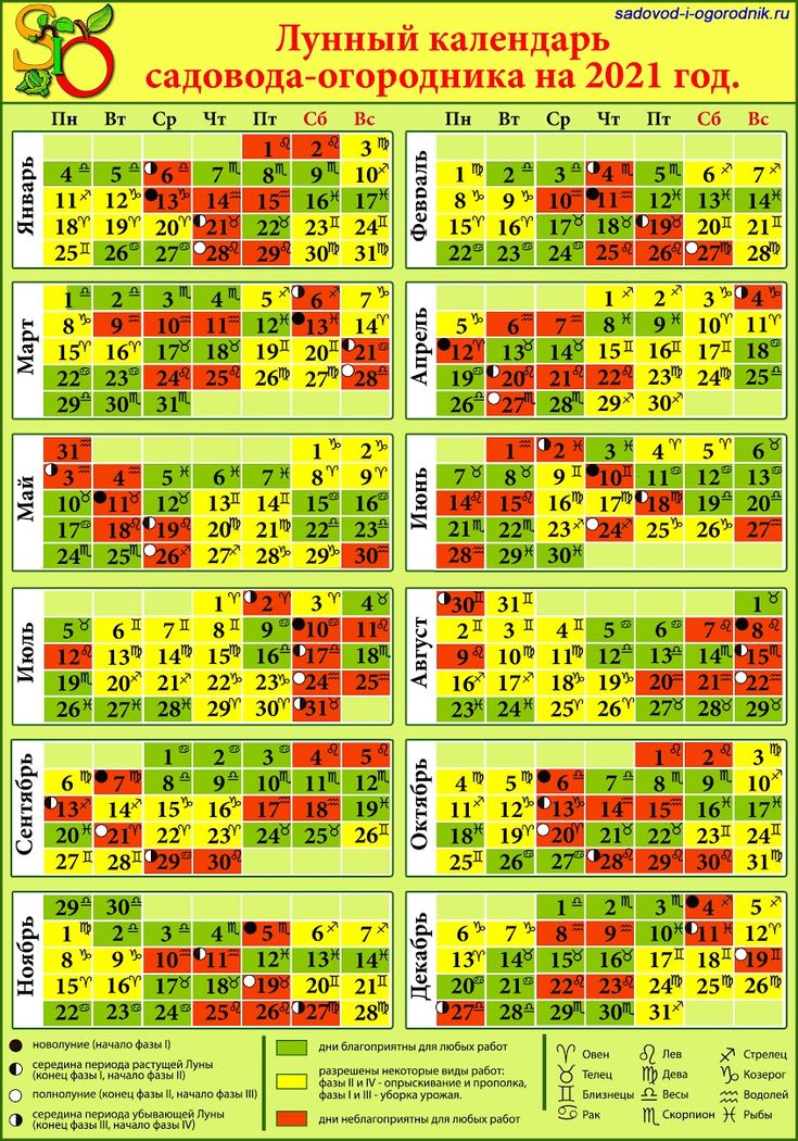 Этот месяц подходит для уборки листьев и других растительных отходов. Для фруктовых деревьев проводят санитарную обрезку.Фазы Луны: 1-08.10 — растущая, 9.10 — полная, 10-24.10 — убывающая, 25.10 — новолуние, 26-31.10 — растущая.НоябрьСадовые деревья в ноябре многие дачники обрабатывают раствором медного купороса. В этом месяце еще можно сделать санитарную обрезку деревьев, если эта процедура не была проведена ранее. Кроны хвойных обвязывают тканью. Лапником нужно укрыть клубнику, а неиспользованный компост — пленкой.Фазы Луны: 1-7.11 — растущая, 8.11 — полная, 9-23.11 — убывающая, 24.11 — новолуние, 25-30.11 — растущая.ДекабрьС веток деревьев и кустов, крыши теплиц необходимо убрать снег. В этом месяце можно заготовить черенки плодовых и хвойных деревьев для весенней прививки. При необходимости приобретают посадочный материал.Фазы Луны: 1-7.12 — растущая, 8.12 — полная, 9-22.12 — убывающая, 23.12 — новолуние, 24-31.12 — растущая.Посевной календарь по регионуПериод посева, особенности ухода за рассадой и перенос ее в открытый грунт или теплицу различаются в зависимости от региона.