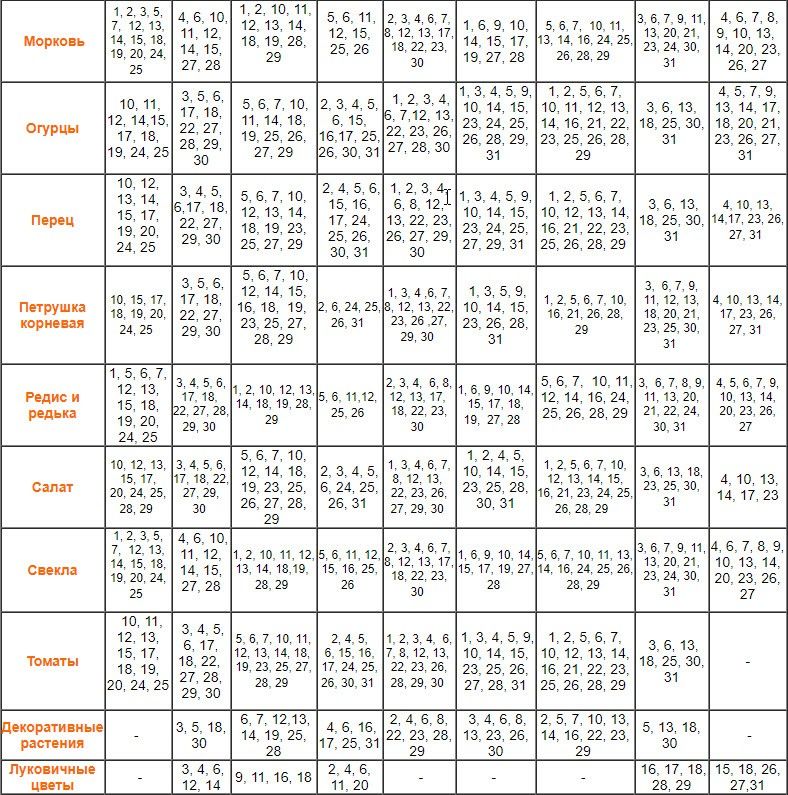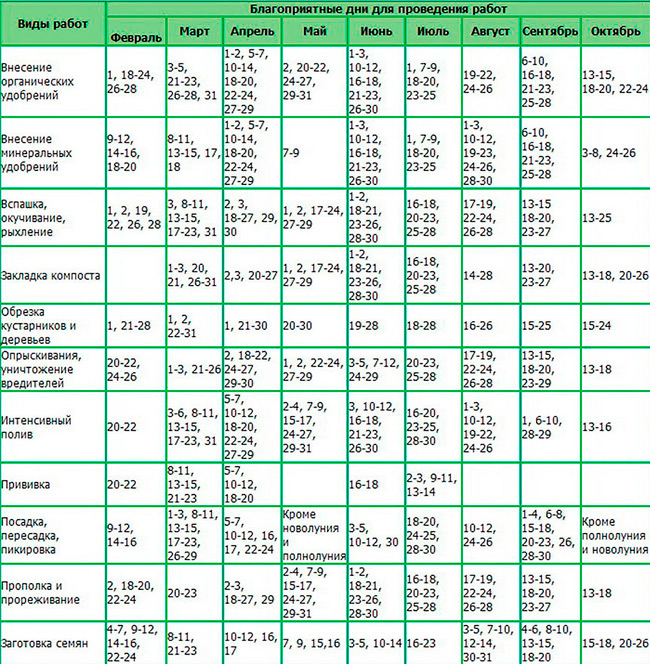 | посадка, пересадка, пикировка | 9-12, 14-16 | 1-3, 8-11,13-15, 17-23, 26-29 | 5-7, 10-12, 16-17, 22-24 | кроме ново- луния и полно- луния | 3-5, 10-12, 30 | 18-20, 24-25, 28-30 | 10-12, 24-26 | 1-4, 6-8, 15-18, 20-23, 26, 28-30 | кроме ново- луния и полно- луния | — | — |