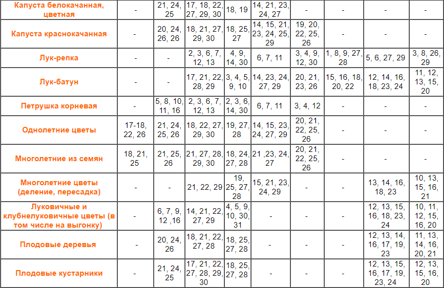 Капуста (обычная, брокколи, цветная) | 18–21, 23, 24 числа. Допустимо высевать капусту 27, 28 сентября. | 14, 15 и 16 сентября (новолуние) и день полнолуния — 29 число. |