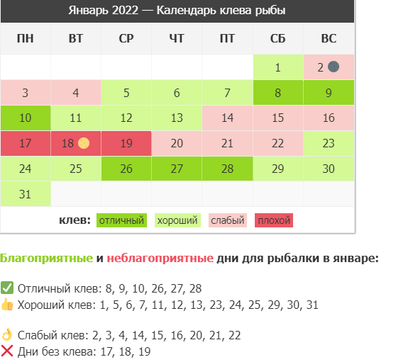 Люди тысячи лет занимаются рыбалкой и на основании ежедневных наблюдений определили, что в некоторые дни рыба активно клюет, а в некоторые даже не смотрит на наживку — для рыбалки есть благоприятные дни, а есть и неблагоприятные дни.