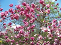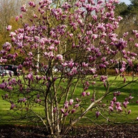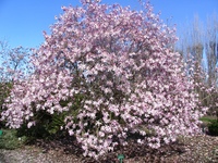 Магнолия, которая своими красивыми розовыми цветами напоминает сакуру. У кустарника очень крупные бутоны, стройный ствол и тонкие ветви. Кора серая, листовые пластинки темно-зеленые.