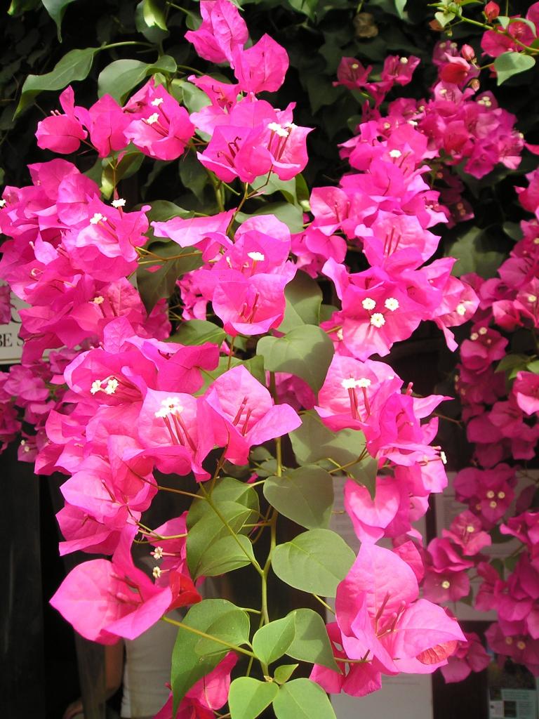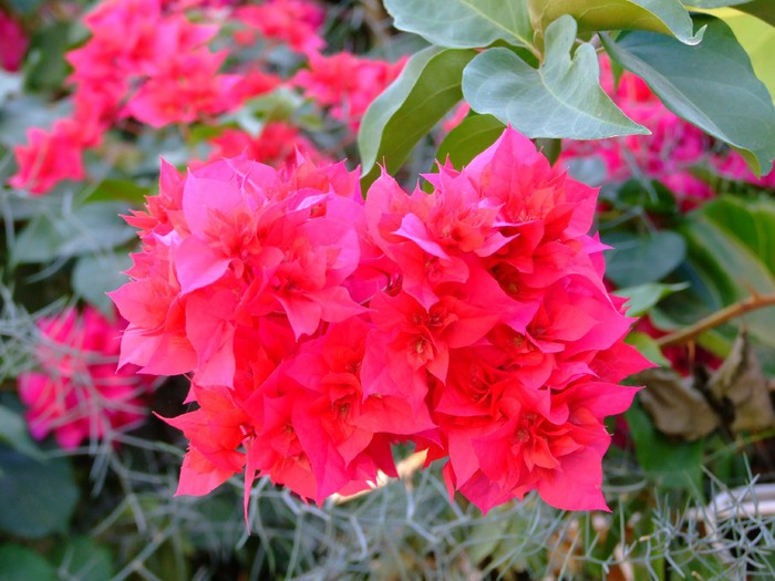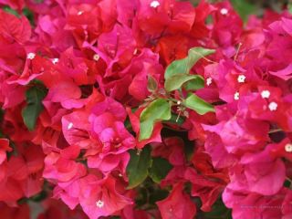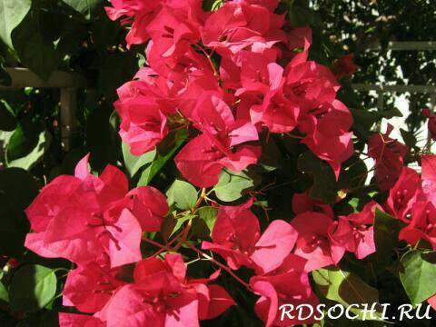 Бугенвиллия прекрасная. Длинные гибкие побеги полукустарников покрыты бархатистой тёмно-зелёной листвой на длинных черешках. В период цветения почти вся крона скрывается под цветами с яркими листочками. Вначале они окрашены в насыщенный красный оттенок, но со временем бледнеют и становятся почти белыми.