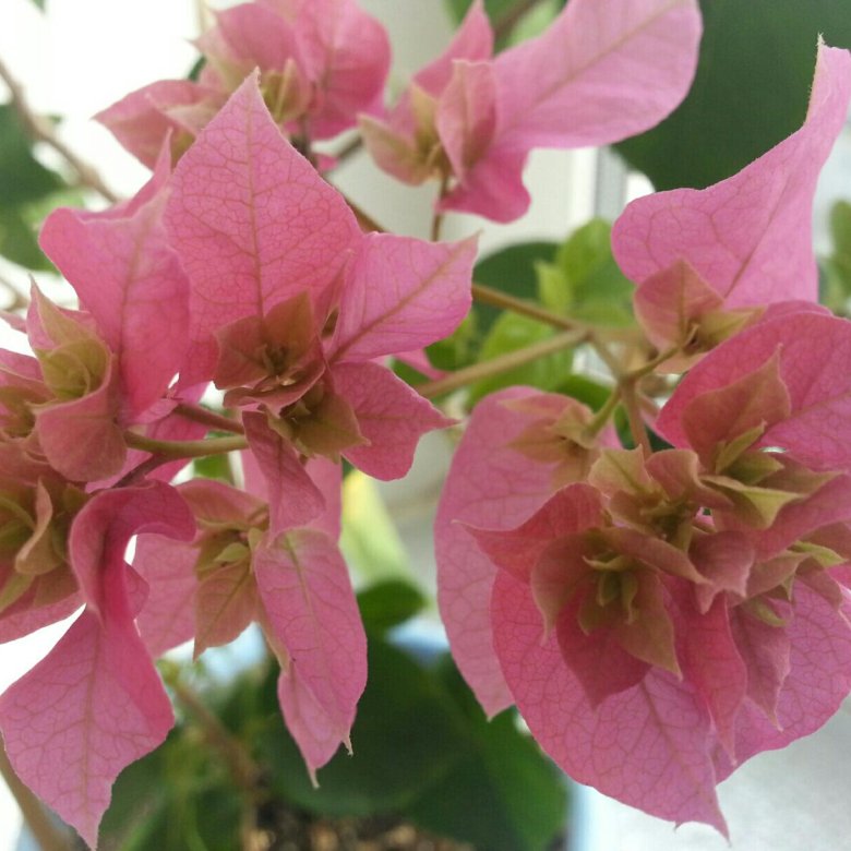 Бугенвиллия относится к семейству Ночецветных или Никтагиновых. На своей родине, в Южной Америке, Бугенвиллия встречается повсеместно в виде цветущих кустарников или деревьев с гибкими ползучими, лазающими и цепляющимися за все подряд ветками — лианами. Их побеги покрыты редкими, но острыми колючками, с помощью которых растение цепляется к опорам и тянется вверх. Колючки домашних сортов Бугенвиллии селекционеры убрать пока не смогли. Растут побеги очень быстро, достигая в длину пяти и более метров. В домашних условиях при хорошем содержании куст тоже может вырасти до трех метров в высоту. Его рост сдерживают регулярной обрезкой.