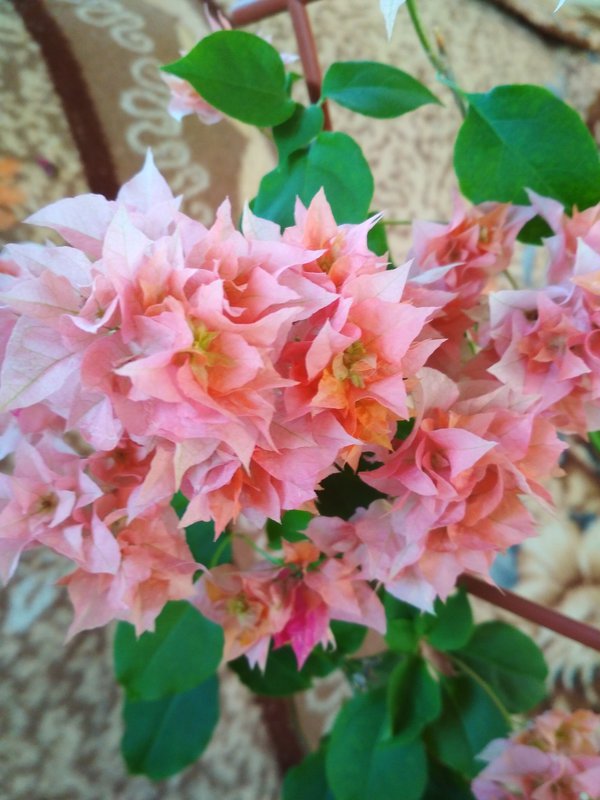 Бугенвиллия перуанская. Длинные побеги не дают боковых отростков. Они покрыты узкой листвой, в основании которой скрываются короткие шипы. Разновидность стабильно распускает большое количество соцветий. Их прицветники имеют махровую форму и слегка морщинистую поверхность.