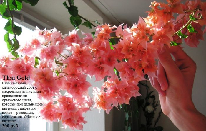 Сорт Бугенвиллии Thai Gold имеет золотисто–оранжевые прицветники, которые на момент увядания становятся полностью розовыми с румянцем.