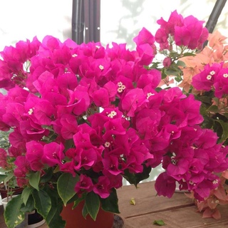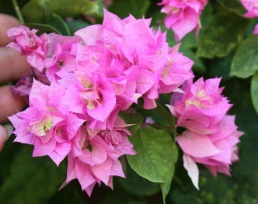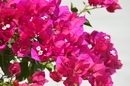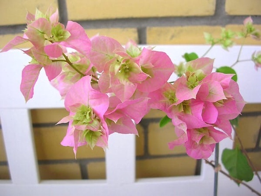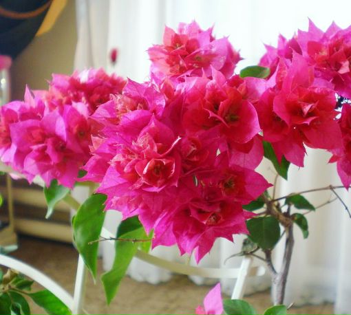 Цветки у Бугенвиллии трубчатые, невзрачные, бело-желтого цвета, собраны в кистевидные соцветия. Они быстро вянут и опадают. Зато прицветники поражают своим великолепием. На ощупь они похожи на тончайшую мятую бумагу. Окрашены прицветники броско, ярко, во все оттенки красного, малинового, белого, оранжевого, фиолетового и других цветов. И по своей форме прицветники не менее удивительны. Они бывают округлыми, стреловидными, сердцевидными и, даже, треугольными. В длину они достигают 3 – 5 см. В отличие от цветков, прицветники сохраняются на растении очень длительное время.