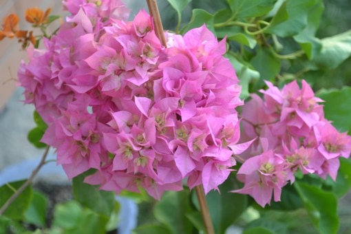 Бугенвиллия Bois De Roses в начале цветения имеет оранжевые прицветники, которые постепенно меняют свою окраску на насыщенно-розовую.