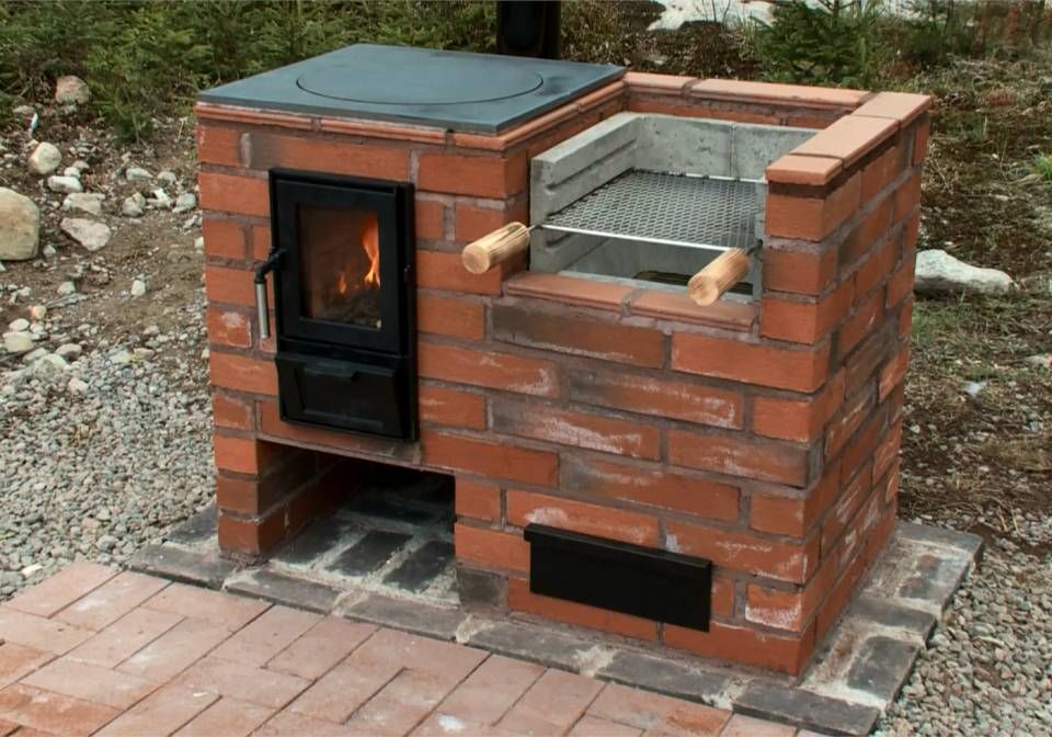 Последний вариант, что мы хотим представить, — это более сложная в исполнении уличная печь для дачи. Тут понадобится некоторый опыт и знание печного дела. Печь предназначена не только для приготовления шашлыков, но и для готовки пищи, поскольку снабжена варочной панелью. В данном случае устройство уличной печи предусматривает наличие дымооборота и требует большего количества материалов и фурнитуры: