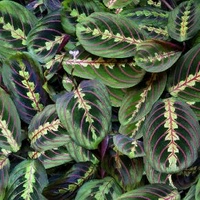 Маранта трехцветная (триколор). Декоративно-лиственное растение представляет собой кустик, размеры которого в высоту и ширину имеют 30 см. Опушенные листья в длину достигают 12 см и имеют овальную форму. Фон верхней стороны листовой пластины темно- или светло-зеленый. Рисунок листьев состоит из красных жилок и темно-зеленых пятен вдоль боковых и светло-зеленых пятен вдоль центральных жилок. Снизу листовые пластины имеют малиновый окрас и розовые жилки. Цветет маранта триколор цветками светло-сиреневого оттенка.