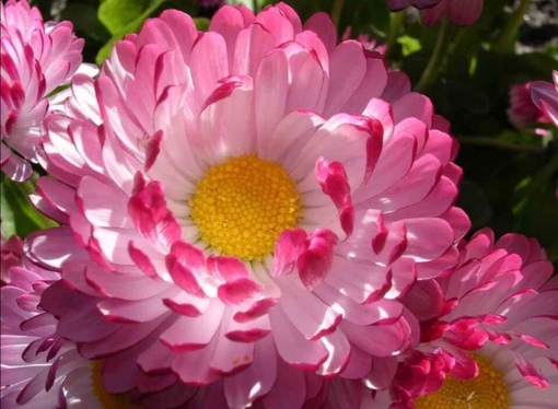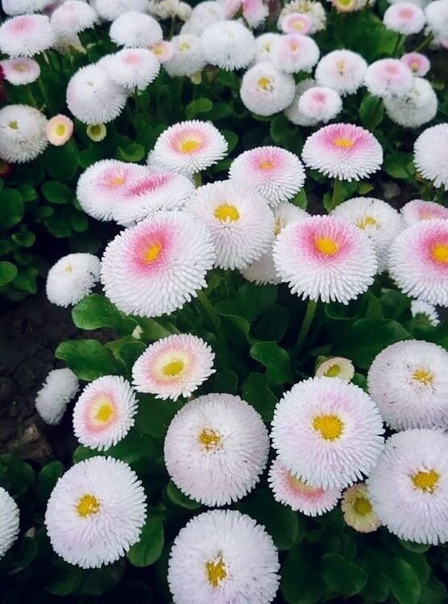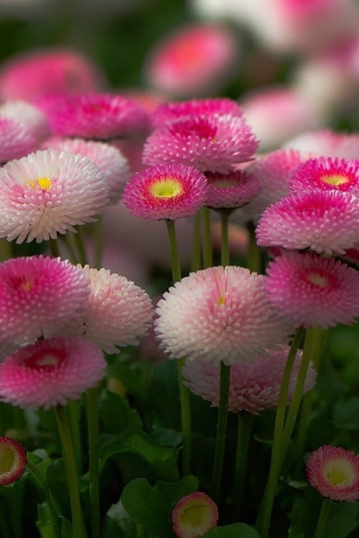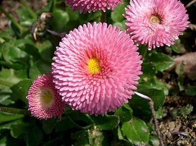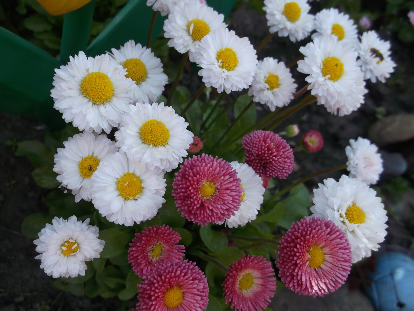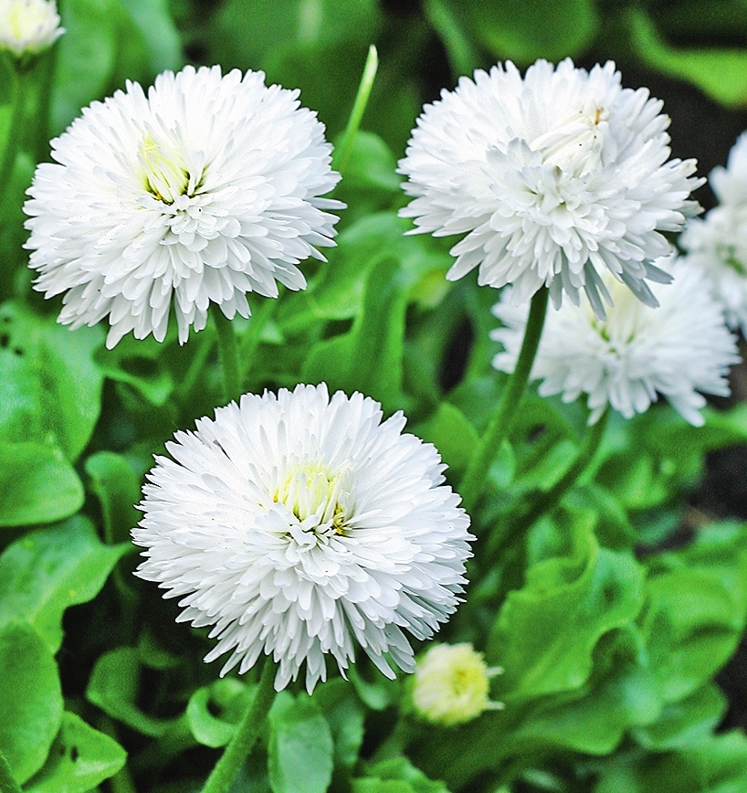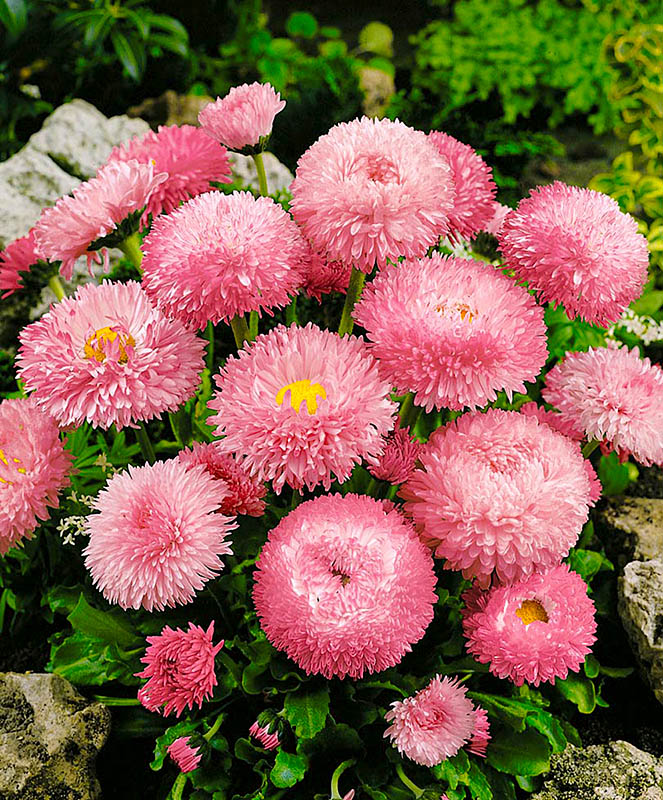 Садовые многолетние маргаритки, цветущие весь летний сезон, произошли от дикорастущих однолетних цветов — bellis annua – из Европы. Растения украшают газоны, бордюры, альпийские горки. Растут в емкостях на балконах, улицах, в садах.