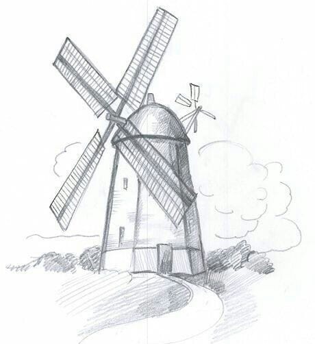Как нарисовать мельницу поэтапно карандашом?