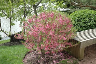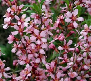 Листопадный кустарник, с шаровидной кроной. Ветки прямостоячие, красновато-серые, с густо покрытыми узкими листьями. Ярко-розовые цветки одиночные, распускаются с листьями и в изобилии украшают кустарник. Цветение длится 7 дней.