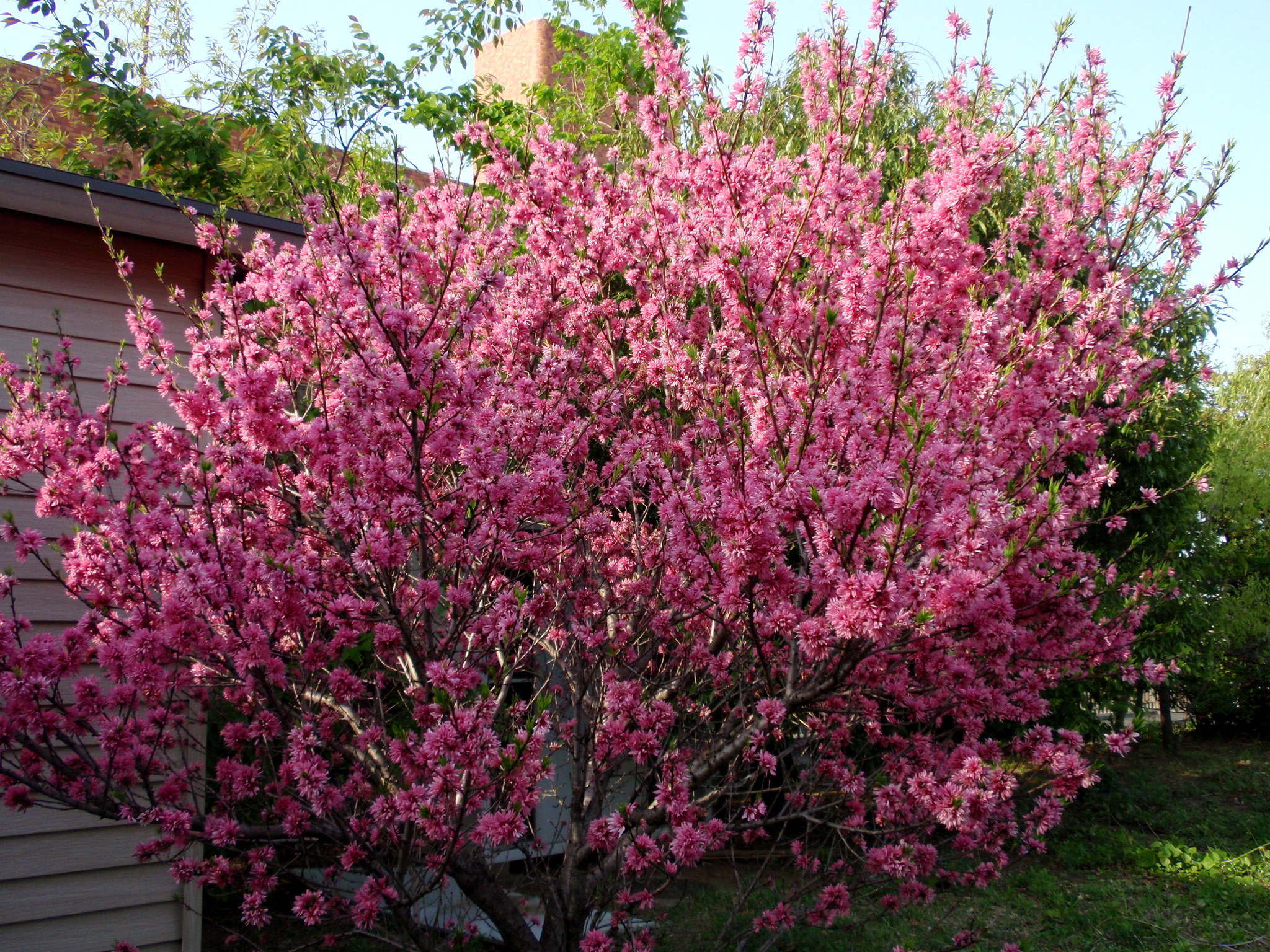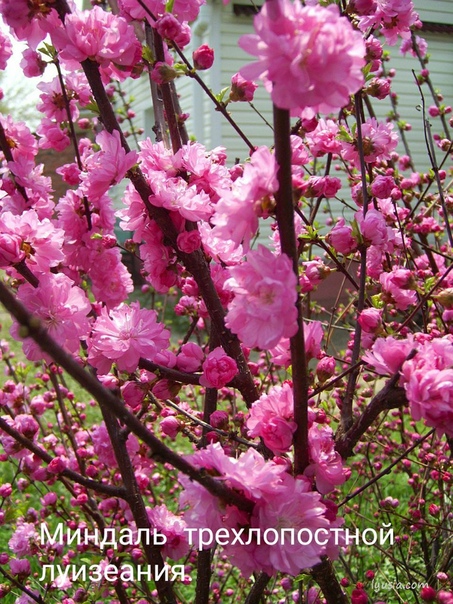 Высокорослому, до 3-5 м, миндалю трехлопастному, растению происхождением из Китая, в последнее время дали другое название – луизеания трехлопастная. Его побеги с серой корой создают раскидистую крону с листьями из трех лопастей. Цветет крупными, до 3-3,5 см густомахровыми или простыми венчиками насыщенного розового и малинового цвета. Сортов у вида много.