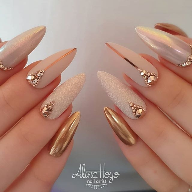 На миндалевидной форме ногтей маникюр с камнями смотрится шикарно и очень эффектно. Дизайн ногтей с камнями — это всегда беспроигрышный вариант маникюра, который понравится всем.