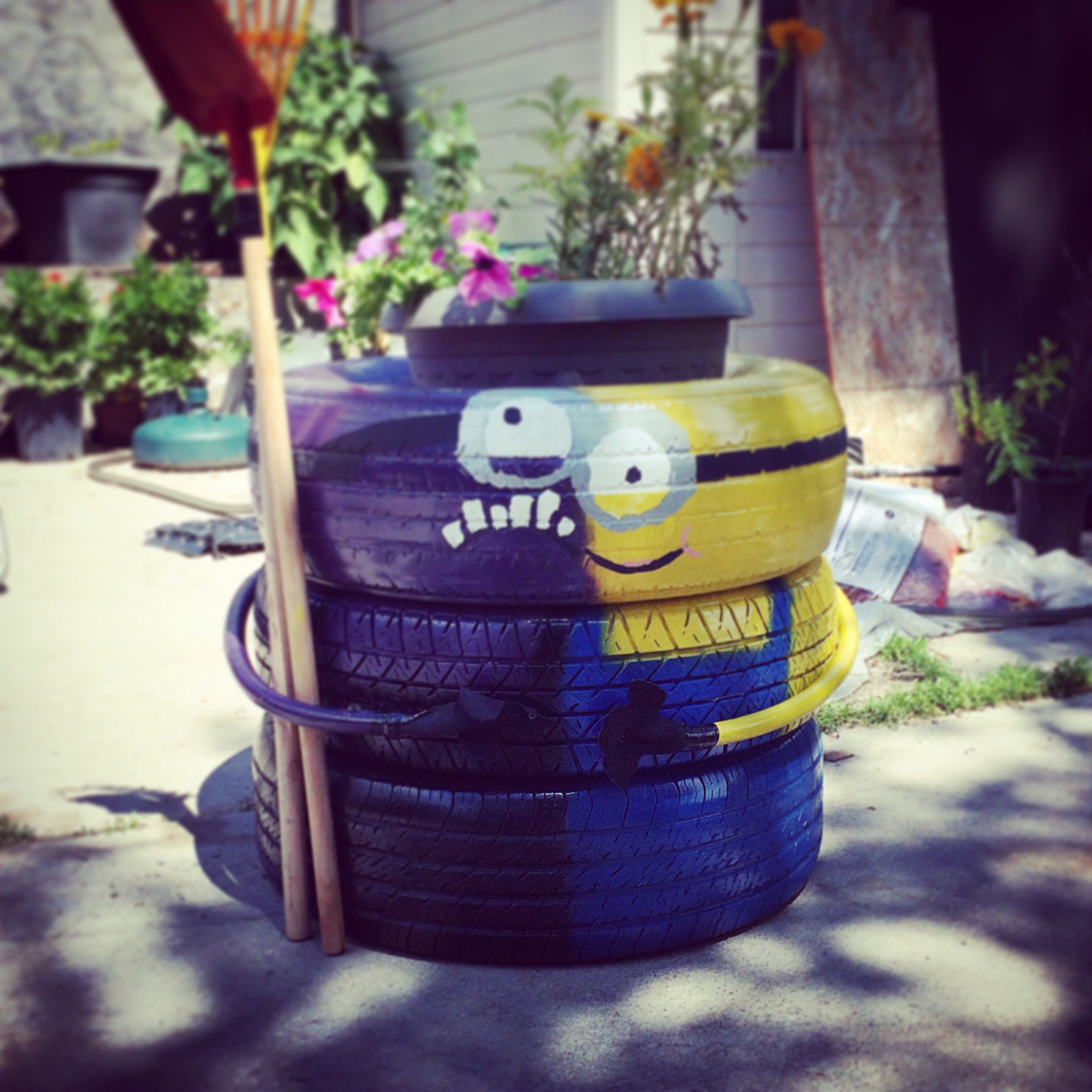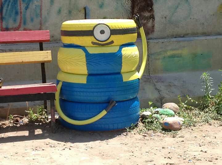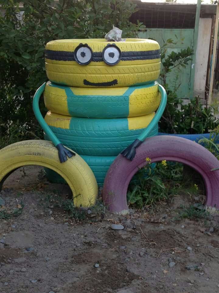 Много интересного можно увидеть на придомовых территориях в районе Нейбута. Совушки из цветочных горшков, слоник с хоботом из шланга, веселые миньоны в голубых комбинезонах и танк – все из тех же покрышек и бутылок.