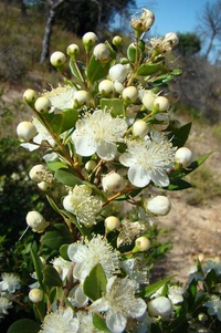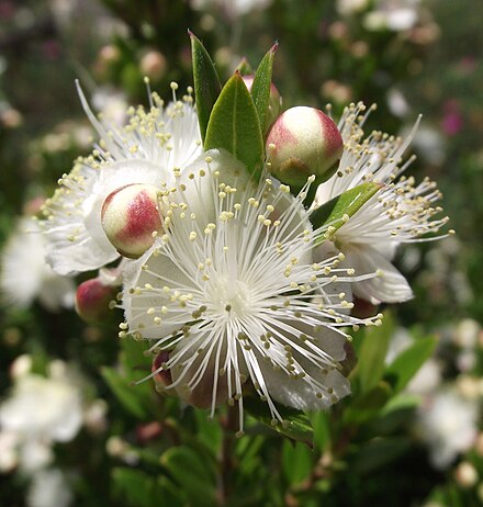 Мирт обыкновенный (Myrtus communis). Растет в подлеске вечнозеленых дубов и сосен и в зарослях кустарников в Средиземноморской области, на Азорских островах, в Северной Африке. Деревья или кустарники до 3-4 м высотой; побеги 4-гранные, мелковолосистые, округлые, голые. Листья супротивные, иногда собранные по 3, яйцевидные, ланцетные, 2-4 (до 5) см длиной и 1-2 см шириной, заостренные, кожистые, цельнокрайные, гладкие, голые, глянцевитые.