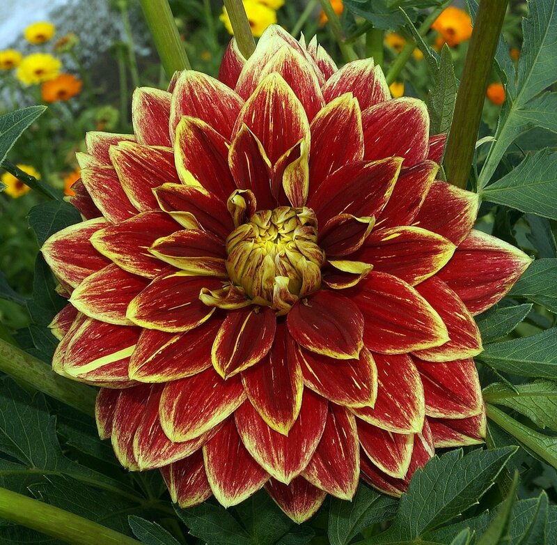 Он довольно прочный, но вес цветков и сильный ветер может его сломать. - Соцветия-корзинки, диаметр которой колеблется от 3 см у георгин-лилипутов до 25 см и больше у высокорослых сортов. Оно состоит из краевых язычковых цветков, которые имеют самую разнообразную окраску и внутренних трубчатых, чаще всего желтых. В зависимости от сорта соцветие может состоять только из краевых цветков или иметь видоизмененные трубчатые.